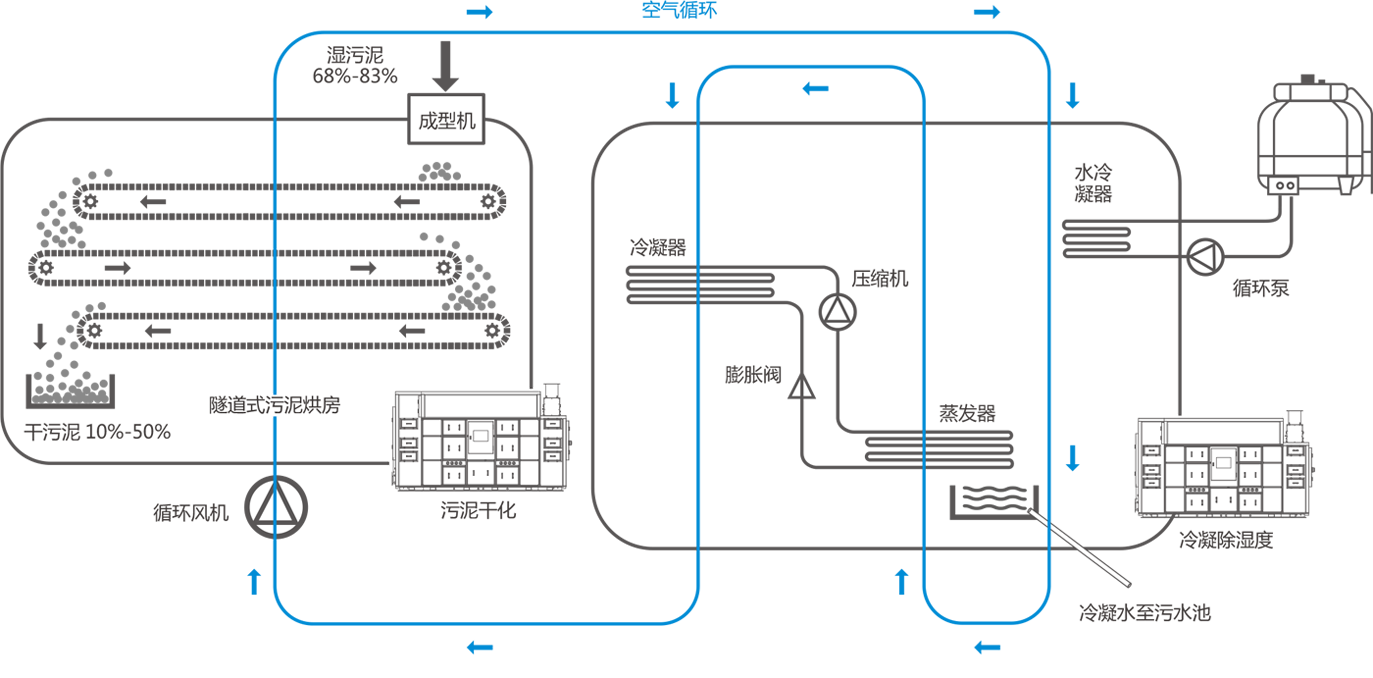污泥除濕干化機(jī)是利用除濕熱泵對(duì)污泥采用熱風(fēng)循環(huán)冷凝除濕烘干;